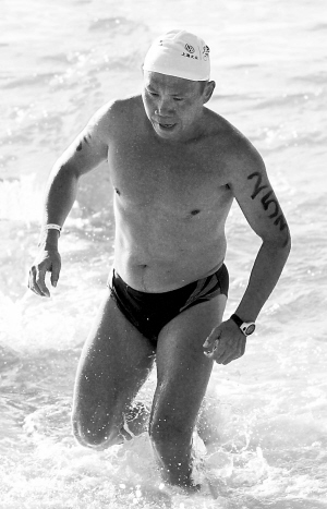 | 游泳是铁人的考验之一,而老赵从不输给年轻人。 |