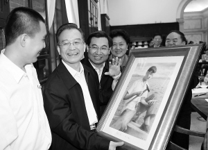 | 一名清华大学美术学院的学生向温家宝赠送名为《祖国·大地》的绘画作品。 新华社发 |