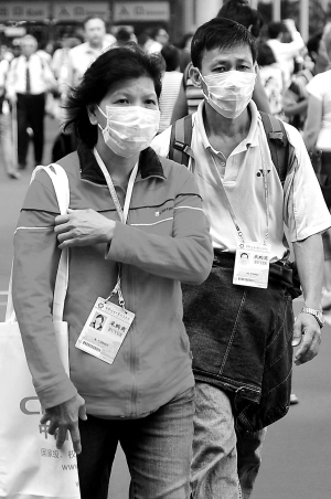 ←5月3日,广交会展馆内一些参会人员戴着口罩。 广交会第三期3日开幕,将有来自200个国家和地区的近13万客商参加。为防范甲型H1N1流感疫情,大会相关部门投入60台红外人体体温探测设备进行体温监测。 新华社发