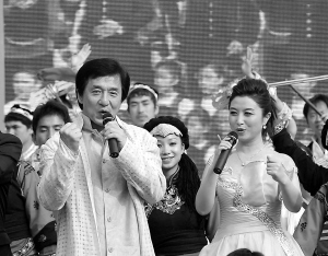 5月3日,香港演员成龙(左)和内地歌唱演员刘媛媛共同演唱《国家》。 当日,香港市民与内地400多名少数民族青少年欢聚维多利亚公园,以喜庆热闹的“少数民族文化嘉年华”拉开香港庆祝中华人民共和国成立60周年活动的序幕。 新华社发
