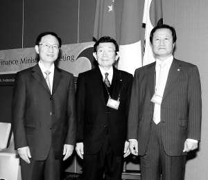 | 5月3日,在印度尼西亚巴厘岛国际会议中心,中国财政部部长谢旭人(左)、日本财务大臣与谢野馨(中)和韩国企划财政部长官尹增铉在会谈前合影。 新华社发 |