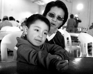 5月2日,墨西哥首位甲型H1N1流感患者,男孩埃尔南德斯康复后和母亲在政府临时搭建的免费食堂休息。新华社发