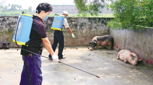 | ←我省农业部门迅速落实各项防控措施,防止疫情传入我省。5月4日,海口市灵山镇屠宰厂,镇畜牧兽医站工作人员正在喷洒消毒。当天,海口市农业局已紧急调运4吨消毒药物,在全海口开始对养殖场等敏感区域进行消毒。