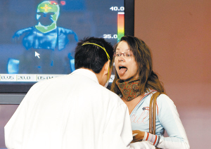 | 5月4日,墨西哥城贝尼托华雷斯国际机场,一名乘客接受健康检查。