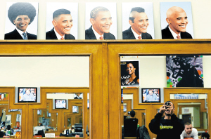 5月4日,在美国洛杉矶的一家理发店内摆放着印有美国总统奥巴马不同发型头像的图像。这家理发店为了吸引顾客,别出心裁地通过电脑制作出一些奥巴马不同发型的头像。 新华社/法新