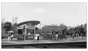 | 公共自行车多功能服务网点由公共自行车存取处和多功能服务亭组成(效果图)。 |