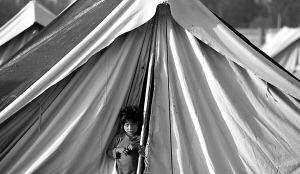 5月6日,在巴基斯坦马尔丹地区一处由联合国难民署设立的难民营,一名儿童钻出帐篷。巴基斯坦政府军和塔利班武装日前在巴西北边境省部分地区持续交战。巴政府计划从交战地区撤离大约50万平民。 新华社/路透