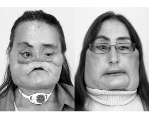 5月5日,美国首名接受面部移植手术的患者向公众展现术后真容。这位更换80%脸部的女患者已重新获得讲话和正常进食的能力。康妮于2004年被丈夫开枪射中脸部导致毁容,自2008年12月10日起在克利夫兰医院接受了共计长达22小时的面部移植手术。术后康妮的脸上仅保留她自己的上眼睑、前额、下嘴唇和下颚。 新华社/法新