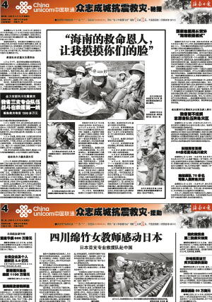 | 二○○八年五月十六日,海南日报报道了海南地震救援队在北川救出易欣的过程。当时,被救出的易欣激动地说:“海南的救命恩人,让我摸摸你们的脸!” |