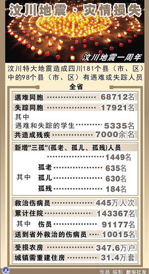 汶川大地震造成近十万人遇难和失踪及上千亿元财产损失,但灾后一年来,全国各族人民万众一心,众志成城,以无所畏惧的英雄气概和可歌可泣的伟大壮举,在中华民族发展史上谱写出新的壮丽诗篇。