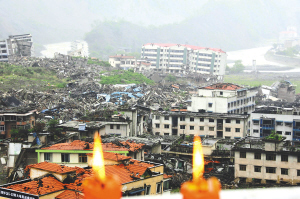 ← 5月7日,人们点燃蜡烛,遥祭北川老县城地震遗址。