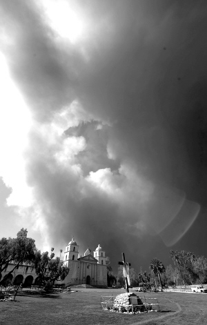 5月6日,在美国加利福尼亚州的圣巴巴拉市,山林大火引发的浓烟笼罩在一所教堂上空。当日,圣巴巴拉市的山林大火继续蔓延,目前已造成至少一人受伤。当地政府通告附近的大约2000名居民尽快撤离。 新华社/法新