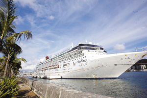 ←凤凰岛国际客运港停靠的外籍船舶(资料图片)。本报记者 程范淦 摄
