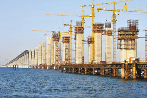 青岛胶州湾海湾大桥是国家高速公路网青岛至兰州高速公路的起始段,大桥全长约35.4公里,其中海上部分长27.089公里。建设中的大桥最高主塔已封顶,主线工程下部结构基本完工,桩基建设已经完成,全面进入桥面施工阶段。 新华社发