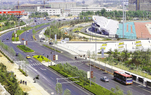 第十一届全国运动会的主场馆济南奥体中心场馆,周边市政道路快车道和慢车道的SMA沥青面层摊铺完成。 新华社发
