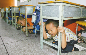 5月8日,海口市第二十五小学一年级四班的同学们在演练地震避灾自救、逃生等项目。 在我国首个“防灾减灾日”来临之际。海口市地震设防中心利用课堂形式,为海口市第二十五小学校师生普及推广防灾减灾知识和避灾自救技能。本报记者 李英挺 摄