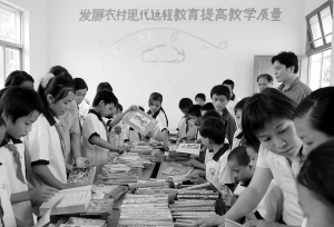 5月8日,由志愿海南爱心社募集的上千册图书以及白沙国税局捐献的文体用品送到了白沙南开乡高峰小学。高峰小学是白沙最为偏远的一所乡村小学。图为学生们认真翻阅新捐赠的图书。 本报记者 苏建强 摄