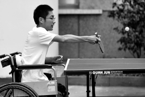 | 22岁的刘畅在地震中失去了双腿,酷爱体育的他最近加入了由四川省残联组建的轮椅网球队。 |