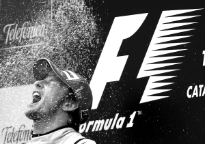 5月10日,在F1西班牙大奖赛中,巴顿夺得冠军。图为布朗GP车队的英国车手巴顿在颁奖仪式上庆祝胜利。 新华社发