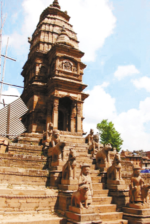 巴德冈距加德满都12公里,经历代的修建,这里有不同时期风格的各种建筑,因此被称为“艺术和建筑技术的发源地”。皇家广场的建筑虽然没有帕坦的密集,但高耸而有造型优美的印度教大石亭特别引人注目。广场东侧是巴德冈皇宫,因有55扇黑漆檀香木雕花窗而得名“55窗宫”,现已辟为尼泊尔艺术博物馆。在一个寺庙的庭院中,只见一个妇女拉着一个小孩,正在进行对我来说十分陌生的宗教仪式,在地上躺着的类似铜制的人体周围摆满鲜花,那妇女不停地在拍响旁边的铜铃,小孩一会儿合掌一会儿叩首,我怎么也看不懂,只是站在旁边看热闹。