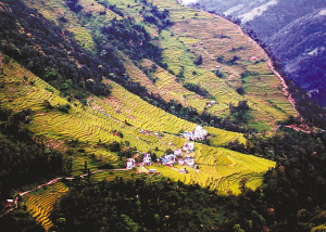 山岭间只要是稍缓一点的坡就被当地人开成了梯田。蓝天、雪山、云雾、森林、梯田、石砌木构的房子、野花、石板路、阳光、还有灵动的人,这不就是一幅绚丽的画卷吗?有时云雾在山林里弥漫,我们就在云雾里穿行。没有风声,只有行进的脚步声;没有喧嚣,只有自然的谐奏曲。