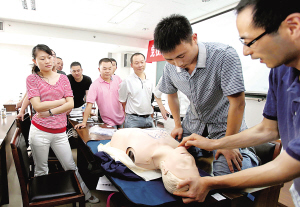←5月11日,浙江瑞安市红十字会的工作人员为当地中青年干部举办现场救护培训活动,迎接5月12日我国首个“防灾减灾日”到来。新华社发 首个“防灾减灾日”