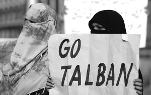 | 五月十日,在巴基斯坦拉合尔市,一名妇女手举标语抗议塔利班武装组织。 新华社/路透 |