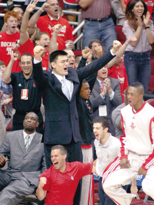 | ← 北京时间5月11日凌晨,因伤缺阵的姚明、穆托姆博等火箭球员也来到现场为队友加油。 新华社发 |