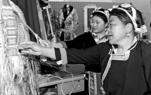 ②5月11日,宝兴县穆坪镇沿江路,两位藏族同胞在挑选色彩鲜艳的布料。