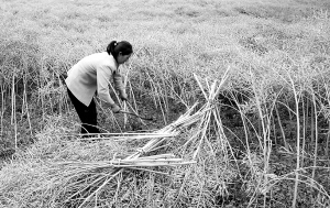 ③5月11日,宝兴县灵关镇河口村,一农妇在田里收割成熟的油菜籽。