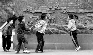 ①5月11日,宝兴县红军长征翻越夹金山纪念馆广场,一群灾区孩子在开心地做游戏。