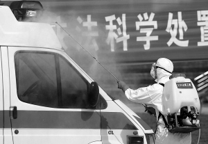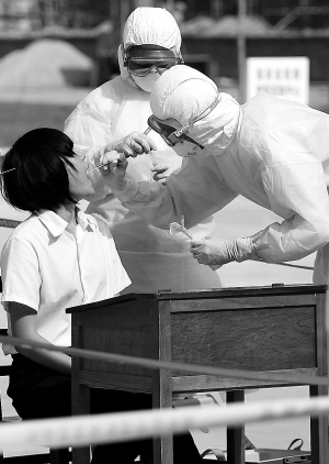 →5月11日上午,我省甲型H1N1流感疫情应急处置演练在省卫校举行。图为采样人员对模拟疑似病例进行采样。