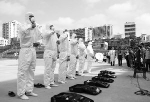 本栏图片均由本报记者林萌摄 ↑穿防护服演示。