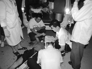 图为志愿者与医生一起救护伤者。