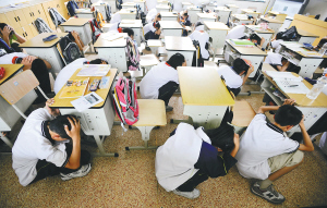 | 5月12日,杭州景成实验学校的学生在进行抗震自我防护演练。