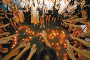 5月12日晚上,在海口市万绿园草坪上,数百市民自发组织在一起,围成心型,点燃蜡烛,哀悼四川汶川特大地震罹难同胞。 本报记者 张杰 摄