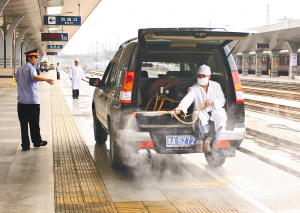 | 5月11日,卫生防疫人员在成都火车站进行消毒工作。我国内地首例甲型H1N1流感病例在成都出现后,成都铁路局启动紧急应对预案,对成都火车站进行全面的预防消毒。