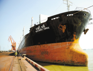 5月12日,一艘外籍货轮在广西北部湾钦州港卸货后准备离港。 广西北部湾港务集团克服国际金融危机给港口发展带来的诸多不利影响,2009年一季度完成货物吞吐量1221.64万吨,同比增长5.79%。 新华社记者张爱林摄