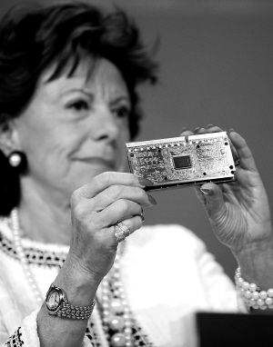 5月13日,欧盟委员会负责竞争事务的委员内莉·克勒斯-斯米特在比利时布鲁塞尔举行的新闻发布会上展示一块电脑芯片。欧盟委员会13日向英特尔公司开出创纪录的10.6亿欧元罚单,并要求英特尔公司停止与超威半导体公司(AMD)的不公平竞争。 斯米特说,多年来英特尔公司滥用自己在电脑中央处理器(CPU)市场上的优势地位,挤压主要竞争对手AMD的市场空间,损害了数百万欧盟消费者的利益。 新华社/法新