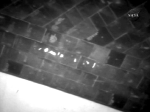 | 美国航天局5月12日发布的电视截图显示“阿特兰蒂斯”号航天飞机隔热板上的刮痕(中间白色部分)。 新华社/路透 |