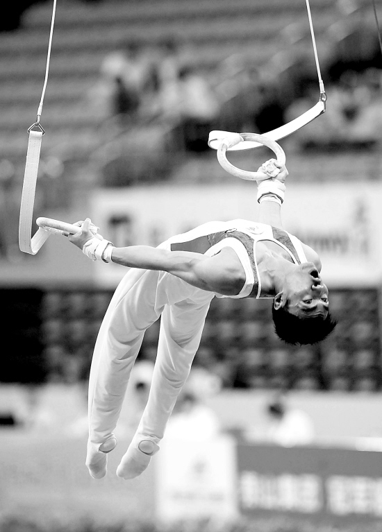 5月13日,在第十一届全运会体操预赛暨2009年全国体操锦标赛男子团体比赛中,广东队获得冠军。图为广东队选手梁富亮在吊环比赛中。 新华社发