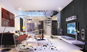 设计说明:本案是以现代个性风格为主的居住空间,客厅造型墙以简洁的马赛克及艺术涂料为主题,客厅与餐厅之间的不绣钢旋转楼梯使整个空间营造出简洁而又个性的居家风格,彰显主人的个性。