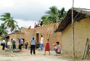 5月13日,海南省乐东黎族自治县抱由镇壳界村的村民在修建新房,新房右侧是正待拆除的茅草房。 据海南省民族宗教事务委员会统计,2009年1至4月份,海南省已完成少数民族民房改造2488户,建筑面积180640平方米,受益人口达11290人,完成全年民房改造任务的31.1%。 新华社记者 郭程摄