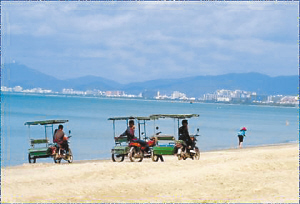 “三亚湾路通车以后,旅游、房地产开发步入快车道,沙滩三轮车便开始上路经营了”。在三亚湾某酒店保安部任职的李先生说,自己所在酒店是三亚湾最早开业经营的酒店之一。开业6年来,酒店和住店游客便一直受到沙滩三轮车的困扰。