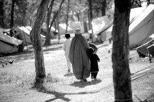 在巴基斯坦的马尔丹地区,一名失去家园的巴基斯坦妇女带着孩子走在难民营里(左图)。巴基斯坦平民乘坐车辆逃离家园,前往设在马尔丹地区的临时难民营(右图)。 新华社/法新
