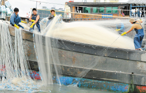 5月15日,海口市世纪大桥下的新港码头,出海归来的渔民们正在收拾网具,准备休渔。
