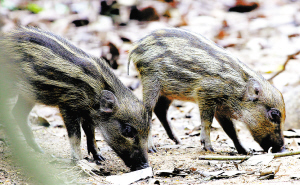 5月12日8时,记者又来到大田碰运气。10时38分,一头雌性大野猪出现了,还有两只小野猪崽哼哼唧唧地跟在它后面。“咔嚓”,记者对准野猪崽按了一下相机快门,大野猪马上一愣神,调头就跑。