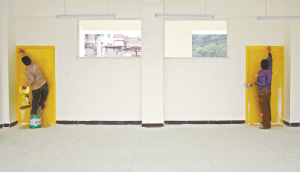 | 宝兴县灵关中心小学,工人正在给教室门扫上有警示作用的黄色油漆,有助安全逃生时辨别方向。 |