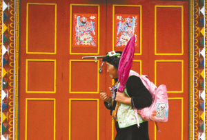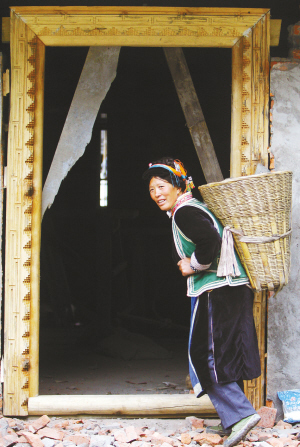 | 宝兴县硗碛乡,新家大门门框上雕刻着各种图案。 |