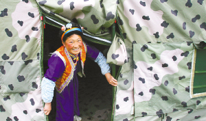| 宝兴县神木垒景区,开始新生活的藏族同胞阿秀掀开帐篷门帘,一脸幸福的笑容。 |